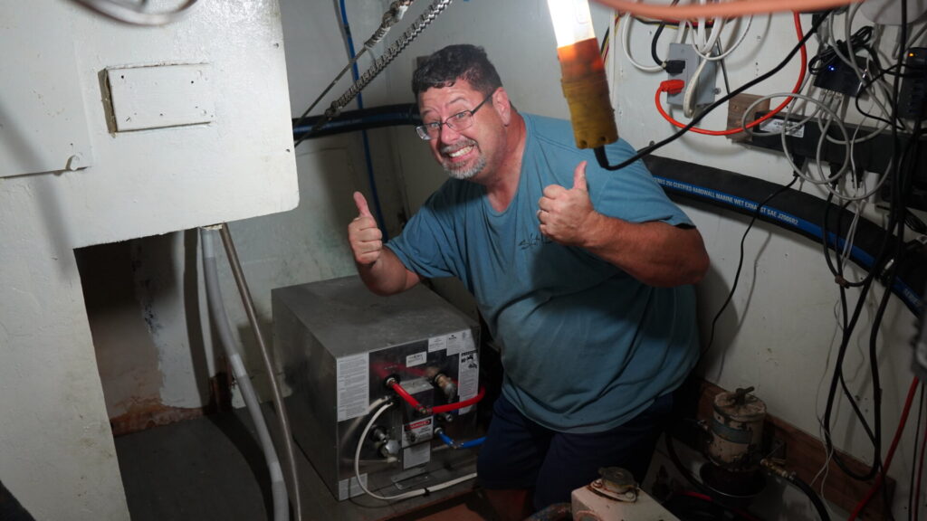 We completed the following projects this month: Removed the old bilge fan from the engine room (ran on 36 volt), added some more electrical outlets to the boat to the settee, captains quarters, fwd cabin and various other places. We also added the fuel fill hose and water fill hose and added new tank sensors for the port side (still have to do for the starboard side) We replaced the holder for the dingy motor, removed the old windlass for inspection so we can get the motor ordered & replaced, Andy started the daunting task of grounding and bonding the boat, added the galvanic isolator. Nancy pressure washed the toe rails (so we can prep to wash and seal with varnish). We start working on the forward bathroom to get the new countertop and sink installed. Nancy completed the pillows and settee cushions. We also prepared our medical kit and ditch bag so we can really get started sailing soon. We also added a new electrical panel for the forward part of boat for a possible 2nd ac unit. How can I forget, we also got the hot water heater installed and the new poop box!!